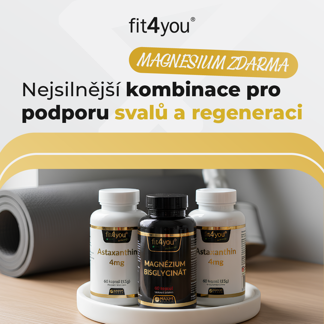 Speciální balíček Fit4You spojuje jeden z nejsilnějších antioxidantů na světě Astaxanthin s vysoce vstřebatelným Magnéziem Bisglycinátem, které podporuje svaly, nervový systém a regeneraci.