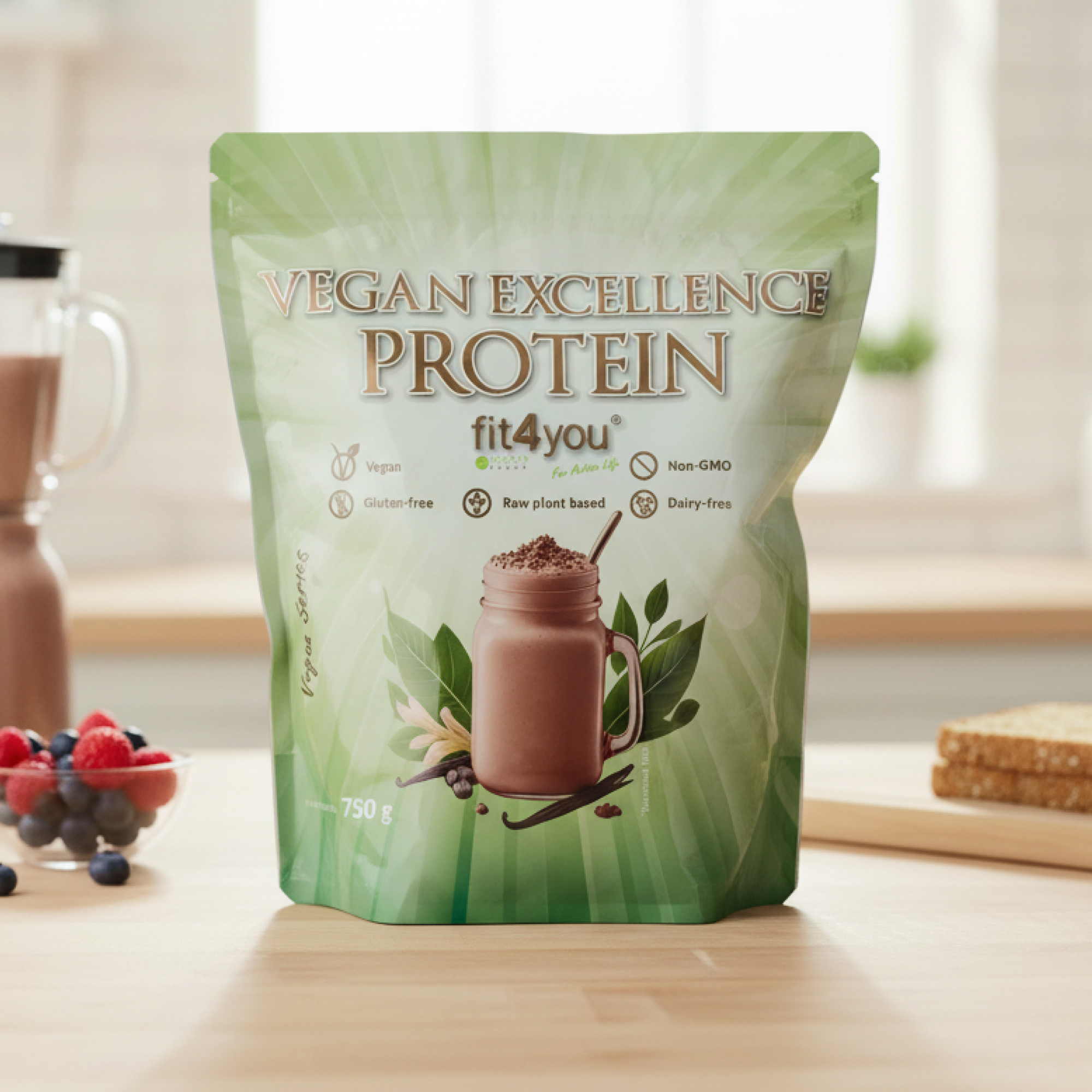 Fit4you Vegan Excellence je rostlinný protein obsahující 72 % rýžového, hrachového a konopného proteinu nejvyšší kvality bez tepelného zpracování. Slazený je speciálním přírodním sladidlem Stevion, které neovlivňuje hladinu cukru v krvi a je vhodný i pro diabetiky a aktivní lidi trpící různými intolerancemi a trávicími potížemi. Přidány jsou trávicí enzymy, vitamín D3 a chuť pravého kakaa.